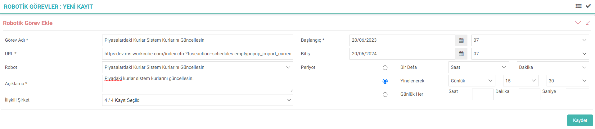 Robotik görevler sadece kur bilgileri ya da standartta yer alan görevler için kullanılmaz. Özel Raporlar ile bağlantısı kurularak belirlenmiş zamanlarda çalıştırılacak herhangi bir görev için de tanımlanabilir.