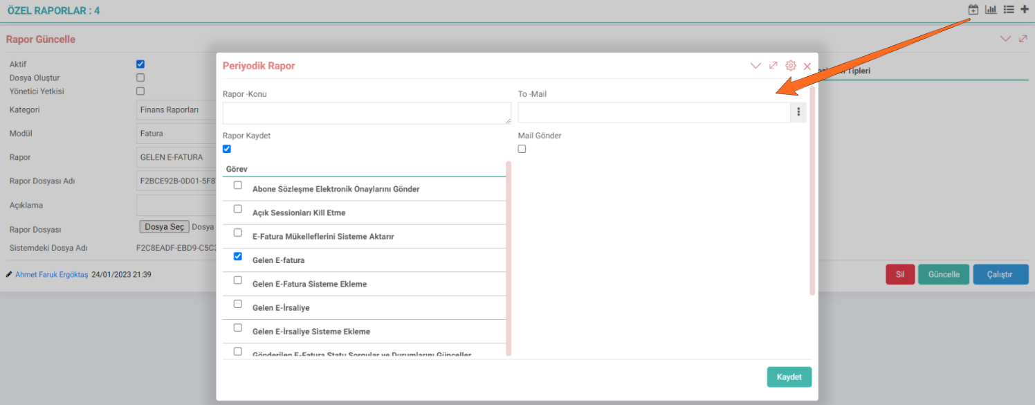 İlişkilendirilen özel rapor; robotik görevlerde girilen periyod doğrultusunda çalışır. Rapor her çalıştığında mail olarak gönderilmesi isteniyor ise “Mail Gönder” kutucuğu işaretlenir ve “To-Mail” bölümüne ilgili kişinin mail adresi girilir. Mail adresi popup üzerinden de seçilebilir. Birden fazla kişiye mail gönderilmesi isteniyor ise "," virgülle ayırılarak girilebilir. “Güncelle” butonuna tıklayarak işlemi tamamlayabilirsiniz.