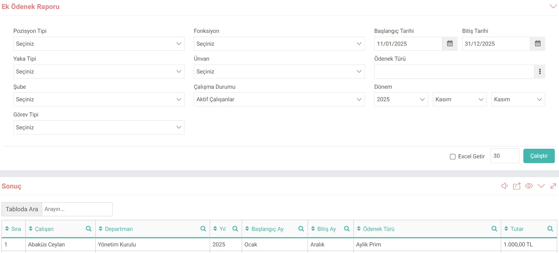 Dikkat: Bu raporda aylık ödenmesi gereken ek ödeneklerin çalışanlara doğru ve eksiksiz olduğunun kontrollerinin yapılmasını sağlamaktadır.