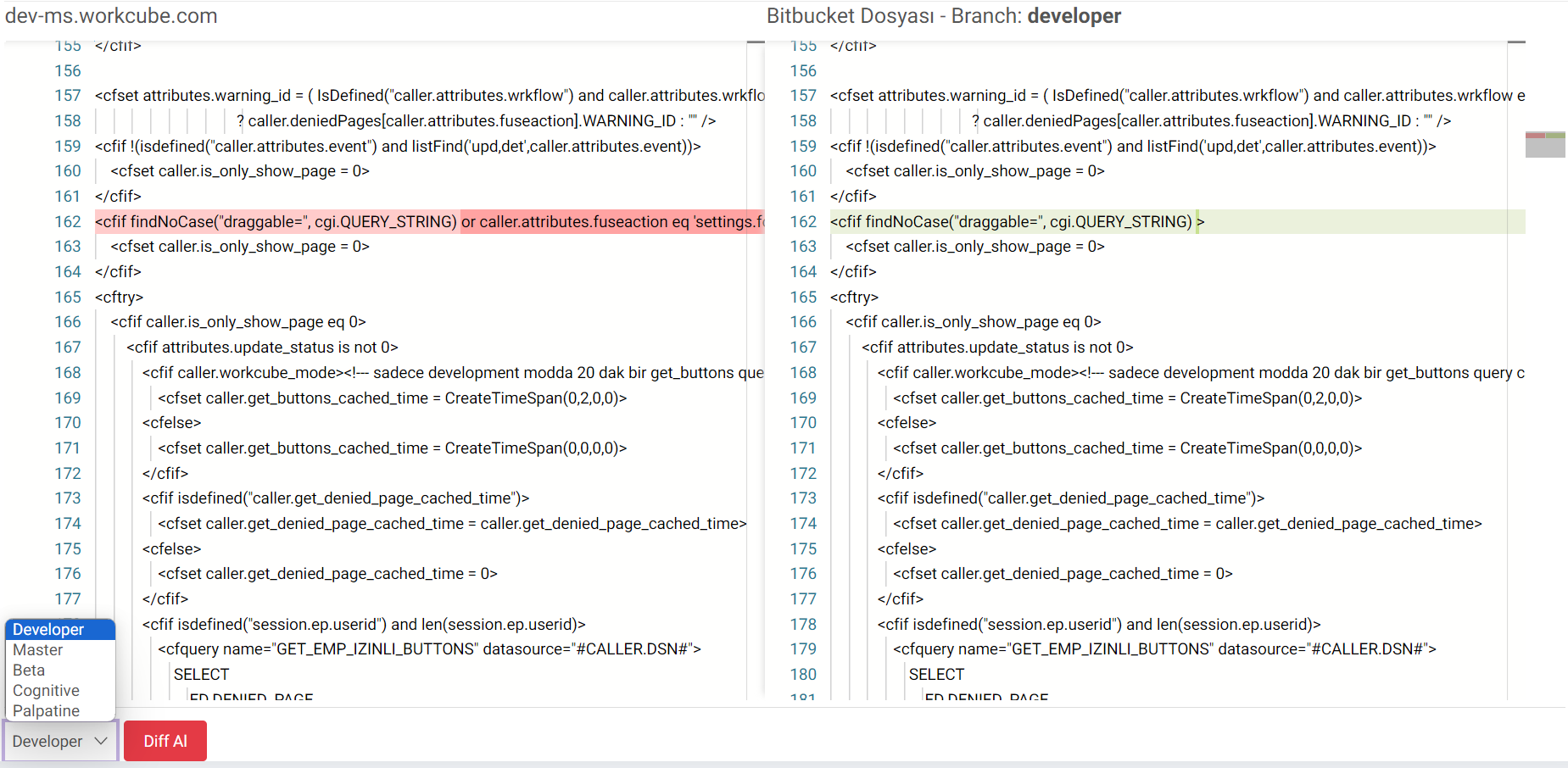 - Farklı branchlerde görüntülemek için sol alt tarafta yer alan developer, master, beta, cognitive, palplatine gibi branchler üzerinden de diff al diyerek kontrol edilebilir.