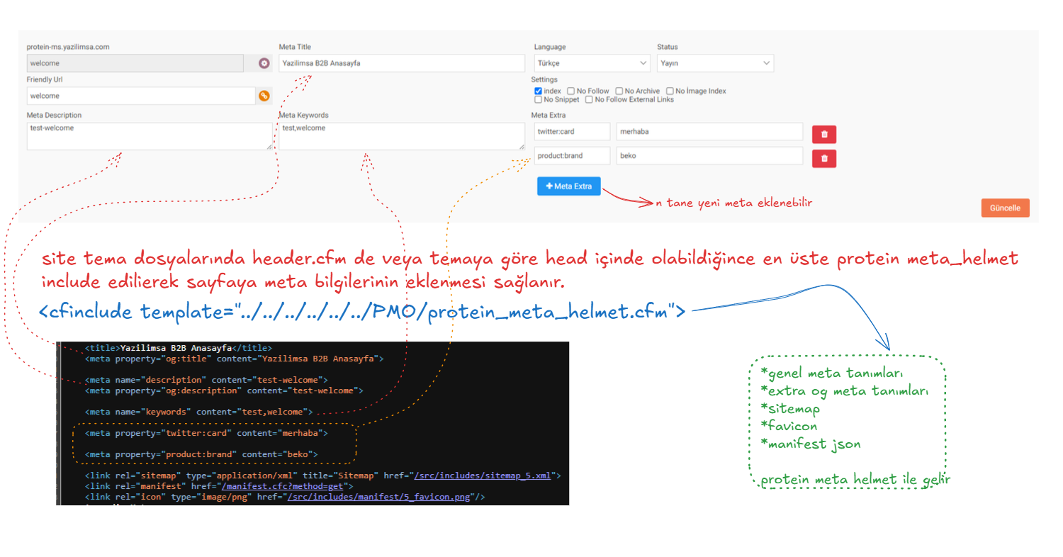 header.cfmdosyasındaprotein_meta_helmet.cfminclude edilir. - Sayfa render edildiğinde kısmına otomatik olarak meta etiketleri eklenir.