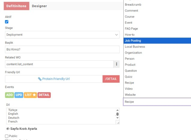 Yukarıdaki seçenekler, sayfanızın içeriğinin türünü (makale, blog yazısı, ürün, etkinlik vb.) belirtmenize olanak tanır ve seçiminize göre uygun schema.org şeması otomatik olarak oluşturularak sayfanıza entegre edilir. Bu sayede, teknik bilgiye ihtiyaç duymadan arama motoru optimizasyonunuzu önemli ölçüde geliştirebilirsiniz.