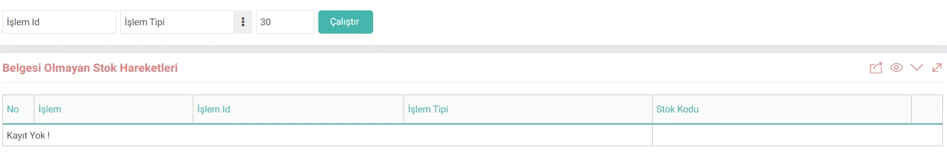Yol: Kontrol Paneli > System > Bakım > Belgesi Olmayan Stok Hareketleri