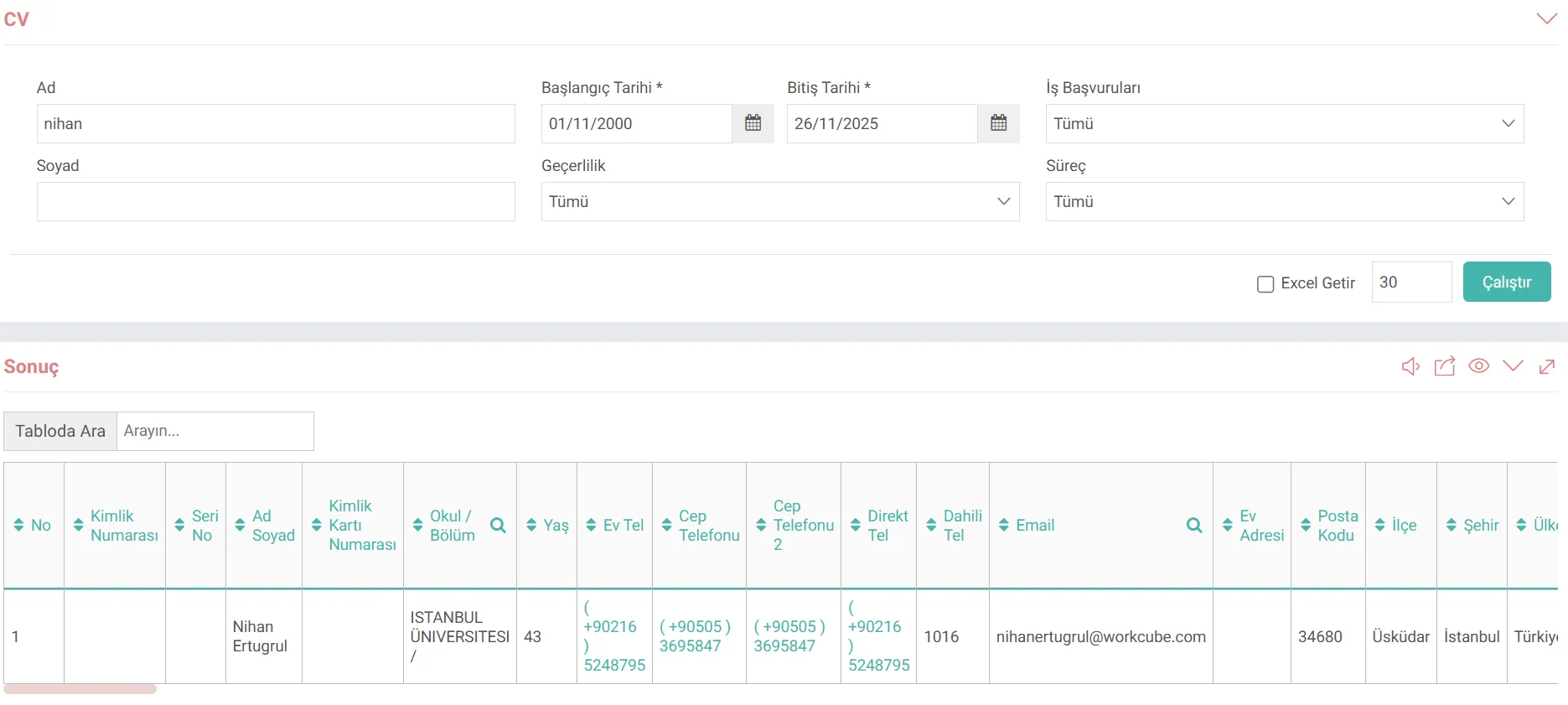 - Ad-Soyad: Veri girişi yapılarak tekil bazlı sorgulama yapılabilir. Doldurulmadığı takdirde bütün özgeçmişler gelecektir.