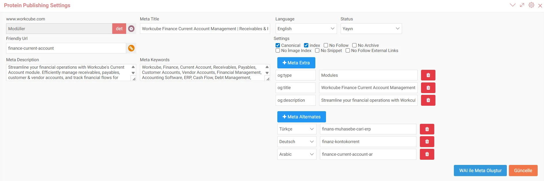 - Meta Keywords: Sayfanın bulunması için anahtar kelimeler önerir. Örneğin: Workcube, finans yönetimi, muhasebe yazılımı, bütçe yönetimi, kurumsal finans, entegre muhasebe, ERP finans, maliyet muhasebesi, nakit akışı, finansal raporlama, e-fatura, e-defter