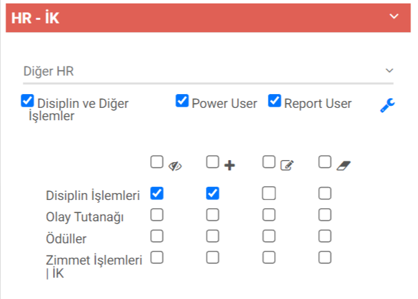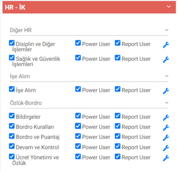Power user yetkisi her bir modül için set edilir. Power User yetkisine sahip olan bir yetki grubu kullanıcısı o modülün parametrelerini, veri çevrimlerini, dil ayarlarını, birinci seviye ekran düzenlemelerini yapabilir.